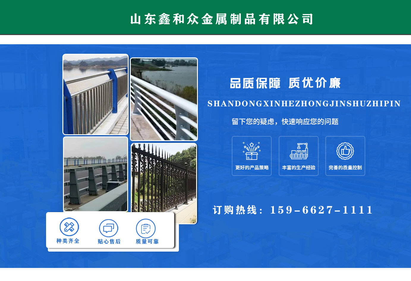 山東鑫和眾金屬制品有限公司主要產(chǎn)品有防撞護欄,橋梁護欄,道路護欄,河道護欄,不銹鋼護欄等護欄。提供設計方案,一站式定制,包您滿意價格優(yōu)惠,歡迎來電咨詢! 公司常年從事銷售護欄防撞護欄,橋梁護欄,道路護欄,河道護欄,不銹鋼護欄,橋梁鋼護欄,河道燈光護欄等。產(chǎn)品廣泛應用于橋梁、河道、旅游景區(qū)、道路、公路、公園、小區(qū)、景觀、道路防撞等領域?! 」井a(chǎn)品均采用優(yōu)質(zhì)不銹鋼材料,符合相關(guān)標準。各種型號不銹鋼復合管及護欄,質(zhì)量嚴格把控。產(chǎn)品強度高、耐腐蝕、焊接牢固、抗沖擊、性能好,防撞護欄結(jié)構(gòu)簡單、美觀實用大方。 歡迎前來訂購!...